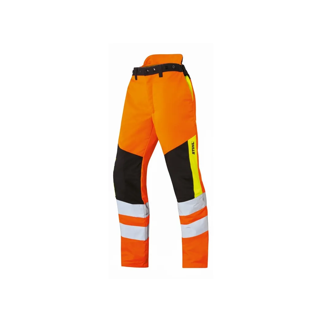 Pevné a pohodlné ochranné nohavice pre prácu s motorovou pílou z mixu funkčných materiálov. Skvelá voľnosť pohybu. Výrazná oranžová farba pre zvýšenú bezpečnosť (EN ISO 20471). Použitý materiál: 100% Polyester/ 65% polyester a 35% bavlna. Spevnený materiál na kolenách a spodnej časti nohy. Dve bočné vrecká, jedna zadná kapsička, jedna meračná priehradka, ochrana obličiek, a zvýšený chrbát na ochranu proti podchladeniu. EN 381, ochranná úroveň 1 (= 20 m / s).